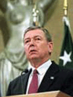 Above: A glum Attorney General Ashcroft, overshadowed by a shiny metal booby