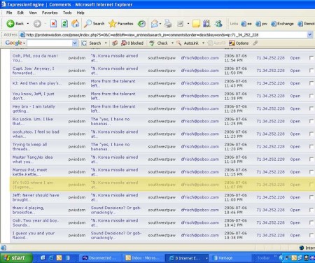Also, I was able to find a window of uptime to grab a screenshot of Deb’s comments by IP from the other night. The screenshot appears below the fold. The comment where she mentioned frenching—which she’s now denying she wrote—is highlighted. See the original here.